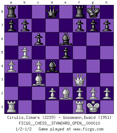 Last move : 1/2-1/2 2021 January 10 15:22:27 [Event "FICGS__CHESS__STANDARD_OPEN__000010"] [Site "FICGS"] [Date "2020.11.16"] [Round "2"] [White "Cirulis,Ilmars"] [Black "Gossmann,Ewald"] [Result "1/2-1/2"] [WhiteElo "2239"] [BlackElo "1951"] 1.c4 e6 2.b3 d5 3.e3 d4 4.exd4 Nc6 5.Bb2 Nxd4 6.Nf3 Bc5 7.Na3 Ne7 8.Nc2 Nef5 9.b4 Nxf3+ 10.Qxf3 Nd4 11.Nxd4 Bxd4 12.Bc3 e5 13.Be2 O-O 14.O-O c6 15.a4 Be6 16.b5 1/2-1/2 English Opening Kingside Castling by player Black (move 13) Kingside Castling by player White (move 14) This chess game ended in a draw. Follow this game move after move (download)There just isn't enough televised Chess. (David Letterman) Der 70jährige Viktor Kortschnoi: Die Rentenanstalt wollte mich zwingen in Rente zu gehen. Meine Frau erhält jetzt eine Pension- und ich zahle weiter in die Rentenkasse ein! (Viktor Kortschnoi) Un sacrificio se refuta mucho mejor al aceptarlo. (Wilhelm Steinitz) Il n'y a pas eu de défaite parce que je ne crois pas que cet ordinateur ait jamais existé. IBM a triché en refusant d'imprimer les modes de recherche de la machine. C'est évident, pendant le match, des coups décisifs ont été joués par des êtres humains. Aujourd'hui, les meilleurs spécialistes en informatique ne peuvent toujours pas expliquer comment Deep-Blue a pu jouer contre la logique des ordinateurs. IBM a gagné une guerre de communication, mais ils sont incapables de prouver que l'ordinateur a gagné tout seul. (Garry Kasparov) It is not enough to be a good player... you must also play well. (Siegbert Tarrasch)