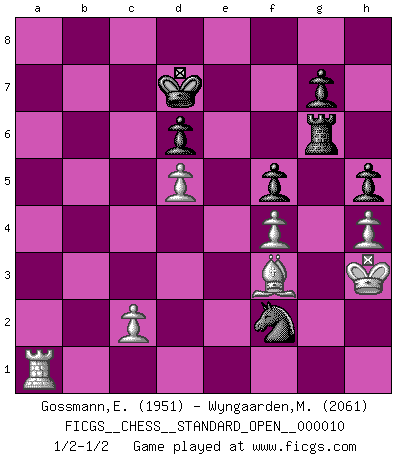 Last move : 1/2-1/2 2020 December 24 17:22:39 [Event "FICGS__CHESS__STANDARD_OPEN__000010"] [Site "FICGS"] [Date "2020.11.16"] [Round "2"] [White "Gossmann,Ewald"] [Black "Wyngaarden,Martin"] [Result "1/2-1/2"] [WhiteElo "1951"] [BlackElo "2061"] 1.e4 c5 2.Nf3 d6 3.d4 cxd4 4.Nxd4 Nf6 5.Nc3 a6 6.h3 e5 7.Nde2 h5 8.g3 Be6 9.Bg2 b5 10.Bg5 Be7 11.O-O Nbd7 12.Nd5 Nxd5 13.exd5 Bf5 14.Bxe7 Kxe7 15.f4 Qb6+ 16.Kh2 Bg4 17.Qd2 Bxe2 18.Qxe2 Kf8 19.a4 bxa4 20.Rxa4 Qxb2 21.Rxa6 Rxa6 22.Qxa6 Rh6 23.Qc6 Ke7 24.h4 f5 25.fxe5 Qxe5 26.Qa4 Rg6 27.Qf4 Qxf4 28.gxf4 Nf6 29.Bf3 Kd7 30.Ra1 Ng4+ 31.Kh3 Nf2+ 1/2-1/2 Sicilian : Najdorf, Adams attack Kingside Castling by player White (move 11) This chess game ended in a draw. Follow this game move after move (download)Chess, like any creative activity, can exist only through the combined efforts of those who have creative talent, and those who have the ability to organize their creative work. (Mikhail Botvinnik) Wir irren allesamt, nur jeder irrt anders. (Georg Christoph Lichtenberg) Hay jugadores fuertes y personas amables y yo soy un jugador fuerte. (Bobby Fischer) La guerre est enfant de la passion, la passion est enfant du narcissisme et le narcissisme est l'enfant. (...) Une autre partie ? (Thibault de Vassal) Lamb in skin of tiger, still fears the wolf. (Chinese proverb)
