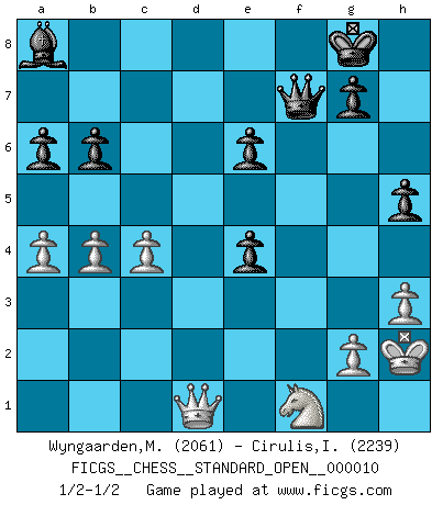 Last move : 1/2-1/2 2021 February 9 15:39:53 [Event "FICGS__CHESS__STANDARD_OPEN__000010"] [Site "FICGS"] [Date "2020.11.16"] [Round "2"] [White "Wyngaarden,Martin"] [Black "Cirulis,Ilmars"] [Result "1/2-1/2"] [WhiteElo "2061"] [BlackElo "2239"] 1.c4 c5 2.Nf3 Nf6 3.d4 cxd4 4.Nxd4 Nc6 5.Nc3 e6 6.a3 Be7 7.e4 O-O 8.Nf3 b6 9.Be2 d6 10.O-O Bb7 11.Bf4 Qc7 12.Rc1 Rac8 13.Re1 Qb8 14.b4 Ne5 15.Nd2 a6 16.h3 Rc7 17.Be3 Ba8 18.Qa4 Qb7 19.Red1 Rfc8 20.Qb3 h6 21.a4 Qb8 22.f4 Ng6 23.Rf1 Nh4 24.Bf2 Nd7 25.Rcd1 Re8 26.Bh5 Rf8 27.Bg3 Qd8 28.Kh2 Bf6 29.Be2 Qe7 30.Rfe1 R7c8 31.Bg4 Rfd8 32.Nf1 Ng6 33.Ne3 Bxc3 34.Qxc3 Nf6 35.f5 Nxe4 36.Qb3 Nxg3 37.fxg6 Ne4 38.gxf7+ Qxf7 39.Nf1 h5 40.Bf3 d5 41.Bxe4 dxe4 42.Rxd8+ Rxd8 43.Rd1 Rxd1 44.Qxd1 1/2-1/2 English : Symmetrical, Benoni formation Kingside Castling by player Black (move 7) Kingside Castling by player White (move 10) This chess game ended in a draw. Follow this game move after move (download)The King is a fighting piece. Use it ! (Wilhelm Steinitz) Der Knackpunkt bei der Konzentration ist, daß wir nur durch sie etwas Neues und Ungewöhnliches am Schachbrett finden können. Sie ist der einzige Weg durch neue neue Ideen eine Überraschung zu bereiten. (Garry Kasparov) El Ajedrez te enseña a controlarl la excitación inicial que sientes cuando vez algo que parece bueno y te enseña a pensar objetivamente cuando te encuentras en problemas. (Stanley Kubrick) Seul un grand joueur sait à quel point il joue faiblement. (Xavier Tartacover) No enterprise is more likely to succeed than one concealed from the enemy until it is ripe for execution. (Niccolo Machiavelli)