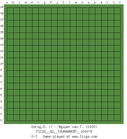 Last move : 0-1 2020 December 21 9:19:1 [Event "FICGS__GO__TOURNAMENT__000074"] [Site "FICGS"] [Date "2020.11.21"] [Round "1"] [Black "Dorog,Devyanosto"] [White "Nguyen van,Thuan"] [Result "0-1"] [Rating 2 "0100"] 0-1 This go game has been lost on time (started : 2020.11.21 0:3:46) Here are the names of the openings (joseki) played in the four corners : Player White won this Go (weiqi, baduk) game. Follow this game move after move (download)In the corner, five stones in a row on the third line are alive. (Anonymous) There are two major products that came out of Berkeley: LSD and UNIX. We do not believe this is to be a coincidence. (Jeremy S. Anderson)