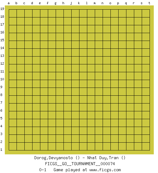 Last move : 0-1 2020 December 21 9:19:1 [Event "FICGS__GO__TOURNAMENT__000074"] [Site "FICGS"] [Date "2020.11.21"] [Round "1"] [Black "Dorog,Devyanosto"] [White "Nhat Duy,Tran"] [Result "0-1"] 0-1 This go game has been lost on time (started : 2020.11.21 0:3:46) Here are the names of the openings (joseki) played in the four corners : Player White won this Go (weiqi, baduk) game. Follow this game move after move (download)Don't make dango's. (Anonymous) The smarter you play, the luckier you'll be. (Mark Pilarski)