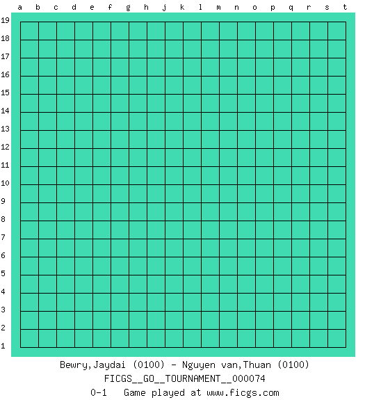 Last move : 0-1 2020 December 21 9:19:1 [Event "FICGS__GO__TOURNAMENT__000074"] [Site "FICGS"] [Date "2020.11.21"] [Round "1"] [Black "Bewry,Jaydai"] [White "Nguyen van,Thuan"] [Result "0-1"] [Rating 1 "0100"] [Rating 2 "0100"] 0-1 This go game has been lost on time (started : 2020.11.21 0:3:46) Here are the names of the openings (joseki) played in the four corners : Player White won this Go (weiqi, baduk) game. Follow this game move after move (download)Six eyes in a rectangle are alive. (Anonymous) Heh, heh, heh. Time to abandon ship. (General Grievous in Star Wars ep.3)