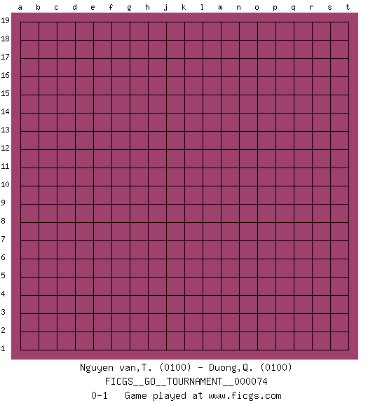 Last move : 0-1 2020 December 21 9:19:1 [Event "FICGS__GO__TOURNAMENT__000074"] [Site "FICGS"] [Date "2020.11.21"] [Round "1"] [Black "Nguyen van,Thuan"] [White "Duong,Quyet Thang"] [Result "0-1"] [Rating 1 "0100"] [Rating 2 "0100"] 0-1 This go game has been lost on time (started : 2020.11.21 0:3:46) Here are the names of the openings (joseki) played in the four corners : Player White won this Go (weiqi, baduk) game. Follow this game move after move (download)In the opening, when you don't know what to play, make a shimari. (Jansteen) Players are not good because they find tactics, it is about the way to find the positions in which those tactics are hidden. (Luc-Olivier Leclerc)