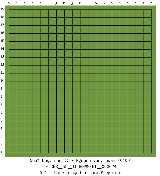Last move : 0-1 2020 December 21 9:19:1 [Event "FICGS__GO__TOURNAMENT__000074"] [Site "FICGS"] [Date "2020.11.21"] [Round "1"] [Black "Nhat Duy,Tran"] [White "Nguyen van,Thuan"] [Result "0-1"] [Rating 2 "0100"] 0-1 This go game has been lost on time (started : 2020.11.21 0:3:46) Here are the names of the openings (joseki) played in the four corners : Player White won this Go (weiqi, baduk) game. Follow this game move after move (download)Everything would seem to be possible in Go. Like pulling a rabbit, by a magical move, out of a hat. (Pierre Audouard) Programmer - an organism that turns coffee into software. (Anonymous)