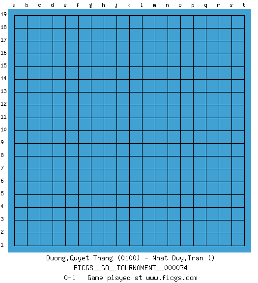 Last move : 0-1 2020 December 21 9:19:1 [Event "FICGS__GO__TOURNAMENT__000074"] [Site "FICGS"] [Date "2020.11.21"] [Round "1"] [Black "Duong,Quyet Thang"] [White "Nhat Duy,Tran"] [Result "0-1"] [Rating 1 "0100"] 0-1 This go game has been lost on time (started : 2020.11.21 0:3:46) Here are the names of the openings (joseki) played in the four corners : Player White won this Go (weiqi, baduk) game. Follow this game move after move (download)Don't disturb symmetry. (Anonymous) There's always a bigger fish. (Qui-Gon Jinn in Star Wars ep.1)