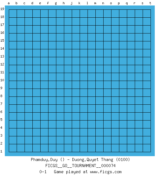 Last move : 0-1 2020 December 21 9:19:1 [Event "FICGS__GO__TOURNAMENT__000074"] [Site "FICGS"] [Date "2020.11.21"] [Round "1"] [Black "Phamduy,Duy"] [White "Duong,Quyet Thang"] [Result "0-1"] [Rating 2 "0100"] 0-1 This go game has been lost on time (started : 2020.11.21 0:3:46) Here are the names of the openings (joseki) played in the four corners : Player White won this Go (weiqi, baduk) game. Follow this game move after move (download)The second line is the line of defeat, the third line is the line of territory, and the fourth line is the line of influence. (Anonymous) Perhaps chess is the wrong game for the times (The Chess Master and the Computer, by Garry Kasparov - 2010)