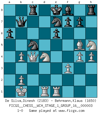 Last move : 1-0 2007 September 30 5:37:41 [Event "FICGS__CHESS__WCH_STAGE_1_GROUP_16__000003"] [Site "FICGS"] [Date "2007.07.11"] [Round "1"] [White "De Silva,Dinesh"] [Black "Behrmann,Klaus"] [Result "1-0"] [WhiteElo "2183"] [BlackElo "1650"] 1.e4 c6 2.d4 d5 3.e5 Bf5 4.Nc3 e6 5.g4 Bg6 6.Nge2 c5 7.h4 h5 8.Nf4 Bh7 9.Nxh5 cxd4 10.Nb5 Nc6 11.Nxd4 Nxe5 12.Bb5+ Nd7 13.Bg5 Ne7 14.c3 a6 15.Ba4 b5 16.Bc2 Bxc2 17.Qxc2 Qc7 18.O-O-O Rc8 19.Kb1 Nc5 20.f3 Qb7 21.Qe2 Rh7 22.Rhe1 b4 23.c4 dxc4 24.Qxc4 b3 25.axb3 Rh8 26.b4 1-0 Caro-Kann : Advance variation Queenside Castling by player White (move 18) Player White won this chess game. Follow this game move after move (download)At this time Fischer is simply a level above all the best Chessplayers in the world. (John Jacobs) Ich habe Kasparov in Rente geschickt. (Veselin Topalov) Botvinnik trató de alejar el misterio referente al Ajedrez, siempre relacionandolo a situaciones de la vida diaria. Solía llamar al Ajedrez un problema inexacto típico, similar a aquellos en que la gente tiene siempre que resolver a cada día. (Garry Kasparov) Psychologiquement, tu dois avoir confiance en toi même, mais cette confiance doit être basée sur des faits. (Robert Fischer) What doesn't kill us makes us stronger. (Friedrich Nietzsche)