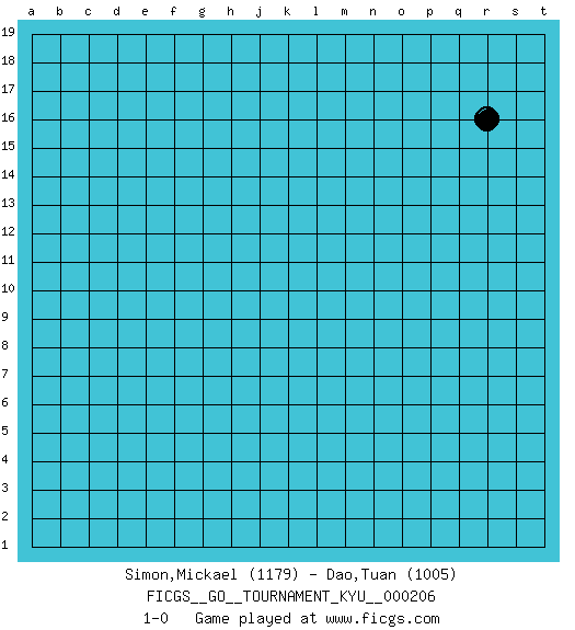 Last move : 1-0 2020 December 22 10:36:29 [Event "FICGS__GO__TOURNAMENT_KYU__000206"] [Site "FICGS"] [Date "2020.11.21"] [Round "1"] [Black "Simon,Mickael"] [White "Dao,Tuan"] [Result "1-0"] [Rating 1 "1179"] [Rating 2 "1005"] 1.r16 1-0 This go game has been lost on time (started : 2020.11.21 0:4:29) Here are the names of the openings (joseki) played in the four corners : Player Black won this Go (weiqi, baduk) game. Follow this game move after move (download)Five liberties for tactical stability. (Anonymous) The difference between perseverance and obstinacy is that one comes from a strong will, and the other from a strong won't. (Henry Ward Beecher)