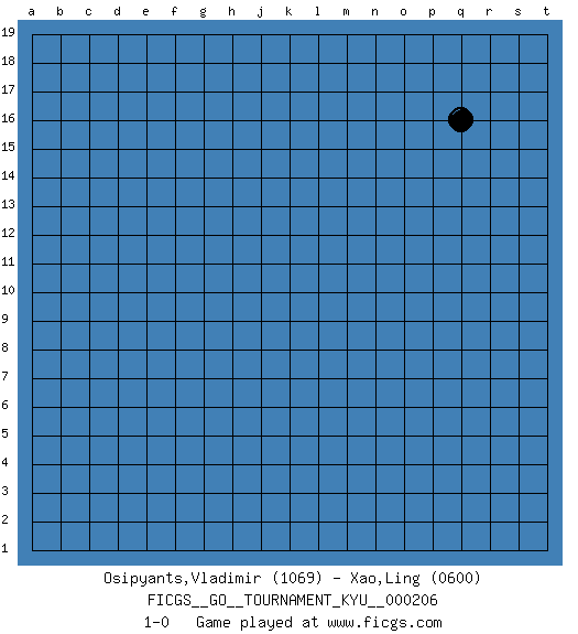 Last move : 1-0 2020 December 21 9:19:1 [Event "FICGS__GO__TOURNAMENT_KYU__000206"] [Site "FICGS"] [Date "2020.11.21"] [Round "1"] [Black "Osipyants,Vladimir"] [White "Xao,Ling"] [Result "1-0"] [Rating 1 "1069"] [Rating 2 "0600"] 1.q16 1-0 This go game has been lost on time (started : 2020.11.21 0:4:29) Here are the names of the openings (joseki) played in the four corners : Player Black won this Go (weiqi, baduk) game. Follow this game move after move (download)You don't have to be really good anymore to get good results. What's happening with chess is that it's gradually losing its place as the par excellence of intellectual activity. Smart people in search of a challenging board game might try a game called Go. (Hans Berliner, The New York Times, 2003) A belief is an idea the mind possesses, an idea that possesses the mind. (Robert Oxden Bolton)