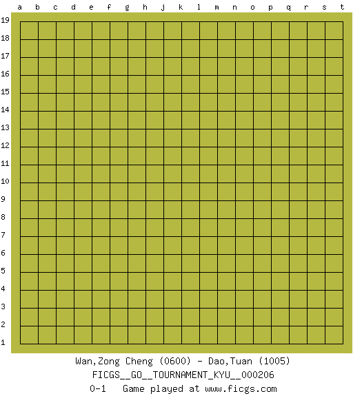 Last move : 0-1 2020 December 21 9:19:1 [Event "FICGS__GO__TOURNAMENT_KYU__000206"] [Site "FICGS"] [Date "2020.11.21"] [Round "1"] [Black "Wan,Zong Cheng"] [White "Dao,Tuan"] [Result "0-1"] [Rating 1 "0600"] [Rating 2 "1005"] 0-1 This go game has been lost on time (started : 2020.11.21 0:4:29) Here are the names of the openings (joseki) played in the four corners : Player White won this Go (weiqi, baduk) game. Follow this game move after move (download)Conservative and slow will win. Believe it ! (Anonymous) Kids, you tried your best and you failed miserably. The lesson is, never try. (Simpsons)