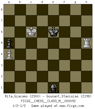 Last move : 1/2-1/2 2021 August 23 20:27:46 [Event "FICGS__CHESS__CLASS_M__000092"] [Site "FICGS"] [Date "2020.11.21"] [Round "1"] [White "Rita,Giacomo"] [Black "Gounant,Stanislas"] [Result "1/2-1/2"] [WhiteElo "2300"] [BlackElo "2198"] 1.e4 c6 2.d4 d5 3.Nc3 dxe4 4.Nxe4 Bf5 5.Nc5 b6 6.Nb3 e6 7.Nf3 Bd6 8.g3 Ne7 9.Bg2 h6 10.O-O Nd7 11.Nbd2 O-O 12.Qe2 Bc7 13.c4 Re8 14.Rd1 Bg4 15.h3 Bh5 16.Ne4 Rc8 17.Nc3 Bd6 18.b3 Nf6 19.Bb2 Qc7 20.Re1 Qb8 21.g4 Bg6 22.Ne5 a5 23.a4 Red8 24.Rad1 Nd7 25.f4 Nf8 26.Rf1 f6 27.Nxg6 Nexg6 28.f5 Nf4 29.Qf3 Nxg2 30.Kxg2 Bb4 31.Ne4 Rc7 32.Rf2 Re7 33.Re2 Qc7 34.Rd3 Rde8 35.Bc1 exf5 36.gxf5 Nh7 37.h4 Qd7 38.R2e3 Nf8 39.Re2 Kh8 40.Kg1 Nh7 41.R2e3 Nf8 42.Kf2 Rc8 43.Rd1 Bd6 44.Kg2 Bb4 45.Ng3 Rce8 46.Ne4 Kg8 47.Kf2 Kh7 48.Kf1 Kg8 49.Kg2 Kh8 50.R1d3 Kh7 51.Re2 Kh8 52.R2e3 Kh7 53.Rd1 Kg8 54.Kf2 Kh7 55.R1d3 Kh8 56.Re2 Rf7 57.Ng3 Rfe7 58.Ne4 Kg8 59.Kf1 Kh8 60.Kg2 Nh7 61.Kf2 Nf8 62.Kf1 Kg8 63.Qg4 Kh8 64.Bxh6 Rxe4 65.Rxe4 Rxe4 66.Qxe4 gxh6 67.Rg3 Kh7 68.Ke2 h5 69.Rg1 Bd6 70.Qg2 Kh6 71.Qg8 Qh7 72.Qxh7+ Kxh7 73.Rd1 c5 74.b4 cxb4 75.Rg1 Nd7 76.Kd3 b3 77.Rb1 Bg3 78.Rxb3 Bxh4 79.Ke4 Kh6 80.c5 bxc5 81.Rb7 Bf2 82.Rxd7 Bxd4 83.Rd8 Kg5 84.Rg8+ Kh4 85.Ra8 Bc3 86.Kd3 Be1 87.Rg8 Bg3 88.Rg6 Be5 89.Kc4 Bb2 90.Kxc5 Bc1 91.Rxf6 Kg4 92.Kb5 Bd2 93.Rd6 Bb4 94.Rd5 Kg5 95.f6 Kxf6 96.Rxh5 Ke6 97.Kc6 Be1 1/2-1/2 Caro-Kann : Classical variation Kingside Castling by player White (move 10) Kingside Castling by player Black (move 11) 10 pieces endgame at move 82 : White KRPP , Black KBPPPP WHITE : King + 1 Rook 2 Pawns BLACK : King + 1 Bishop 4 Pawns 9 pieces endgame at move 90 : White KRPP , Black KBPPP WHITE : King + 1 Rook 2 Pawns BLACK : King + 1 Bishop 3 Pawns 8 pieces endgame at move 91 : White KRPP , Black KBPP WHITE : King + 1 Rook 2 Pawns BLACK : King + 1 Bishop 2 Pawns 7 pieces endgame at move 95 : White KRP , Black KBPP WHITE : King + 1 Rook 1 Pawn BLACK : King + 1 Bishop 2 Pawns 6 pieces endgame at move 96 : White KRP , Black KBP WHITE : King + 1 Rook 1 Pawn BLACK : King + 1 Bishop 1 Pawn This chess game ended in a draw. Follow this game move after move (download)A man that will take back a move at Chess will pick a pocket. (Richard Fenton) Im Schach gewinnt jeder. Hat man Freunde am Spiel - und das ist die Hauptsache - ist auch der Verlust einer Partie kein Unglück. (David Bronstein) ¿Esta Bobby Fischer algo cuerdo?. (Salo Flohr) Comme les marins qui ont mille raisons différentes d'aller en mer, les joueurs d'échecs en ont tout autant avant de s'installer devant une table et jouer... (Vincent Bertignac, philosophe) The problem with manipulation is that people can turn on you. (Horatio Caine, C.S.I. Miami)