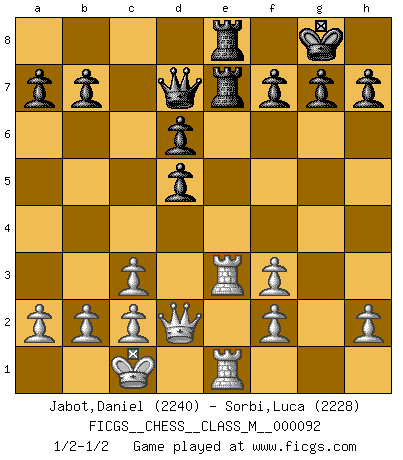 Last move : 1/2-1/2 2021 April 13 6:51:44 [Event "FICGS__CHESS__CLASS_M__000092"] [Site "FICGS"] [Date "2020.11.21"] [Round "1"] [White "Jabot,Daniel"] [Black "Sorbi,Luca"] [Result "1/2-1/2"] [WhiteElo "2240"] [BlackElo "2228"] 1.e4 e5 2.Nf3 Nf6 3.Nxe5 d6 4.Nf3 Nxe4 5.Nc3 Nxc3 6.dxc3 Be7 7.Be3 O-O 8.Qd2 Nd7 9.O-O-O Nf6 10.Bd3 Re8 11.Rhe1 Bg4 12.Bg5 c6 13.Re2 Qd7 14.Rde1 Bxf3 15.gxf3 Nd5 16.Bxe7 Rxe7 17.Be4 Rae8 18.Bxd5 cxd5 19.Re3 1/2-1/2 Petrov : Nimzovich attack Kingside Castling by player Black (move 7) Queenside Castling by player White (move 9) This chess game ended in a draw. Follow this game move after move (download)A man that will take back a move at Chess will pick a pocket. (Richard Fenton) Ein Springer auf f6 gegen die eigene Rochadestellung ist schlimmer als ein rostiger Nagel im Knie. (Efim Bogoljubov) El juego de Fischer siempre fue nítido, racional y brillante. Uno de los mejores por siempre. (Dave Regis) Il s'avisa de me proposer d'apprendre les échecs qu'il jouait un peu... me voilà forcené des échecs. J'achète un échiquier, je m'enferme dans ma chambre, j'y passe des jours et des nuits à vouloir apprendre par cur toutes les parties. (Jean-Jacques Rousseau, Confessions) It's only after you lost everything, Tyler says, that you're free to do anything. (Chuck Palahniuk, Fight Club)