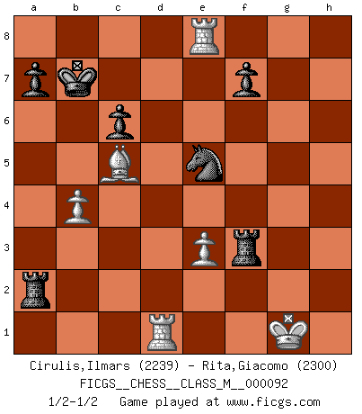 Last move : 1/2-1/2 2021 March 16 15:22:8 [Event "FICGS__CHESS__CLASS_M__000092"] [Site "FICGS"] [Date "2020.11.21"] [Round "1"] [White "Cirulis,Ilmars"] [Black "Rita,Giacomo"] [Result "1/2-1/2"] [WhiteElo "2239"] [BlackElo "2300"] 1.c4 Nf6 2.b3 c5 3.Bb2 Nc6 4.e3 d5 5.cxd5 Nxd5 6.Nc3 Ndb4 7.Qb1 Ne5 8.Bb5+ Bd7 9.Be2 Bc6 10.Nf3 Nbd3+ 11.Kf1 e6 12.h4 Be7 13.Nxe5 Nxe5 14.Ne4 Qd5 15.f4 Ng6 16.Bf3 O-O-O 17.Ng5 Qxd2 18.Bxc6 bxc6 19.Rh3 Bxg5 20.hxg5 Rhg8 21.Qc1 Rd5 22.Qxd2 Rxd2 23.Ba3 h6 24.gxh6 gxh6 25.Bxc5 Rc2 26.b4 Rd8 27.Rxh6 R8d2 28.g3 Rg2 29.Rh7 Rcf2+ 30.Ke1 Re2+ 31.Kf1 Ref2+ 32.Ke1 Rb2 33.Kf1 Rbd2 34.Ke1 e5 35.Rd1 Rxa2 36.Kf1 Rxg3 37.fxe5 Rf3+ 38.Kg1 Nxe5 39.Rh8+ Kb7 40.Re8 Rg3+ 41.Kf1 Rf3+ 42.Kg1 1/2-1/2 English, 1...Nf6 (Anglo-Indian defense) Queenside Castling by player Black (move 16) This chess game ended in a draw. Follow this game move after move (download)The blunders are all there on the board, waiting to be made. (Savielly Tartakover) Ein Großmeister muß tausende Partien in seinem Kopf speichern, denn diese sind für Ihn, was die Worte der Muttersprache für gewöhnliche Leute sind, oder Noten für Musiker... (Garry Kasparov) Debes de llevar a tu oponente hacia un profundo y obscuro bosque donde 2+2=5, y el camino que conduce a la salida es suficientemente ancho para solamente uno. (Mikhail Tal) Les Echecs représentent une sphère d'idées créatrices basée sur la volonté des deux protagonistes. (Smyslov) Nobody is always a winner, and anybody who says he is, is either a liar or doesn't play poker. (Amarillo Slim)