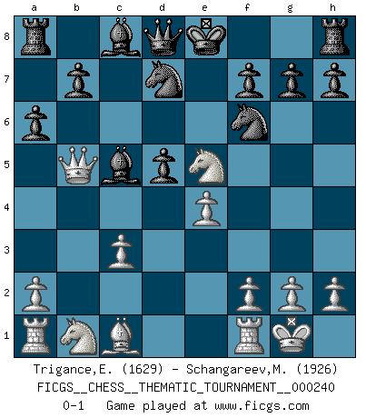 Last move : 0-1 2020 November 23 11:21:18 [Event "FICGS__CHESS__THEMATIC_TOURNAMENT__000240"] [Site "FICGS"] [Date "2020.11.21"] [Round "1"] [White "Trigance,Emile"] [Black "Schangareev,Mirzian"] [Result "0-1"] [WhiteElo "1629"] [BlackElo "1926"] 1.e4 e5 2.Bc4 Nf6 3.d4 exd4 4.Nf3 Bb4+ 5.c3 dxc3 6.bxc3 d5 7.Bxd5 Bc5 8.O-O c6 9.Qb3 cxd5 10.Qb5+ Nbd7 11.Ne5 a6 0-1 Bishop's Opening : Urusov gambit Kingside Castling by player White (move 8) Player Black won this chess game. Follow this game move after move (download)First-class players lose to second-class players because second-class players sometimes play a first-class game. (Siegbert Tarrasch) Die Fehler sind da, Sie warten nur darauf gemacht zu werden. (Savielly Grigorievitsch Tartakower) El Ajedrez es parte de la cultura, y si una cultura esta en decadencia, entonces también el Ajedrez declinará. (Mikhail Botvinnik) Je ne suis pas le dernier à jouer lâchement des coups douteux pendant le zeïtnot de l'adversaire pour l'achever: en effet les coups qui font le plus peur sont ceux que l'on ne comprend pas. Je me fais souvent peur quand je joue. (Un professeur anonyme) As the days dwindle down... to a precious few. (Maxwell Anderson)