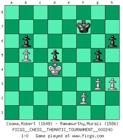 Last move : 1-0 2021 May 17 5:39:34 [Event "FICGS__CHESS__THEMATIC_TOURNAMENT__000240"] [Site "FICGS"] [Date "2020.11.21"] [Round "1"] [White "Csoma,Robert"] [Black "Ramamurthy,Murali"] [Result "1-0"] [WhiteElo "1648"] [BlackElo "1586"] 1.e4 e5 2.Bc4 Bc5 3.Nf3 Nc6 4.O-O Nf6 5.Nc3 O-O 6.d3 h6 7.h3 d6 8.a3 a5 9.Nd5 Nh7 10.c3 Ne7 11.d4 exd4 12.cxd4 Ba7 13.Be3 Nxd5 14.Bxd5 c6 15.Ba2 Qe7 16.Qc2 Be6 17.Bxe6 fxe6 18.b4 axb4 19.axb4 Bb6 20.Nd2 Rxa1 21.Rxa1 e5 22.Qc3 exd4 23.Bxd4 Bxd4 24.Qxd4 Ng5 25.Rf1 Rf4 26.g3 Nf3+ 27.Nxf3 Rxf3 28.Kg2 Rf6 29.Re1 d5 30.Re3 dxe4 31.Qxe4 Qxe4+ 32.Rxe4 Kf7 33.Re5 Rd6 34.b5 Rd5 35.Rxd5 cxd5 36.Kf3 b6 37.Ke3 g5 38.Kd4 1-0 This chess game has been lost on time (started : 2020.11.21 9:11:28) Bishop's Opening : Classical variation Kingside Castling by player White (move 4) Kingside Castling by player Black (move 5) 10 pieces endgame at move 35 : White KPPPP , Black KPPPP WHITE : King + 4 Pawns BLACK : King + 4 Pawns Player White won this chess game. Follow this game move after move (download)Adequate compensation for a sacrifice is having a sound combination leading to a winning position; adequate compensation for a blunder is having your opponent snatch defeat from the jaws of victory. (Bruce A. Moon) Es liegt in der Natur, vernüftig zu denken und unlogisch zu handeln. (Anatole France) No hay precio que no valga la pena por la cabellera del Rey enemigo. (Koblentz) Dieu déplace le joueur, et celui-ci la pièce. Quel Dieu derrière Dieu commence donc la trame ? Arturo Perez-Reverte (prix de littérature policière 1993). Perhaps the current trend of many chess professionals taking up the more lucrative pastime of poker is not a wholly negative one. It may not be too late for humans to relearn how to take risks in order to innovate and thereby maintain the advanced lifestyles we enjoy. And if it takes a poker-playing supercomputer to remind us that we can't enjoy the rewards without taking the risks, so be it. (The Chess Master and the Computer, by Garry Kasparov - 2010)