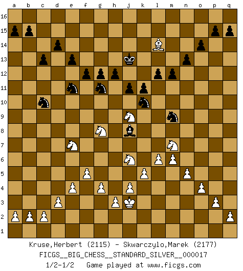 Last move : 1/2-1/2 2021 January 18 16:36:11 [Event "FICGS__BIG_CHESS__STANDARD_SILVER__000017"] [Site "FICGS"] [Date "2020.11.24"] [Round "1"] [White "Kruse,Herbert"] [Black "Skwarczylo,Marek"] [Result "1/2-1/2"] [WhiteElo "2115"] [BlackElo "2177"] 1.j2-k4 h15-g13 2.p1-o3 j15-k13 3.h2-g4 h16-o10 4.b1-c3 p16-o14 5.m2-m4 e15-e13 6.h1-m5 b16-c14 7.l1-p5 k16-h15 8.p5-m8 o10-m12 9.m5-p5 f16-b12 10.g1-j2 g16-j15 11.m8-k10 m12-p12 12.p5-p12 o14-p12 13.e2-e4 m15-m13 14.f1-b5 l16-o13 15.d2-d3 d15-d14 16.c1-h6 o15-o14 17.n2-n4 n15-n13 18.h6-b12 c14-b12 19.o1-f9 c16-k9 20.m1-m3 k9-h7 21.f9-h7 o13-h7 22.m3-l3 o16-k12 23.e1-e3 e16-e14 24.e3-f3 e14-f14 25.f3-f14 h15-f14 26.l3-l7 h7-j8 27.m4-m5 m13-m12 28.k1-h2 k12-l11 29.k10-f6 f14-d13 30.a1-e1 p12-n11 31.q1-m1 j16-h15 32.f6-l11 k13-l11 33.g4-h6 j8-p14 34.h2-g4 m16-m13 35.e1-e3 m13-j13 36.e3-f3 q16-m16 37.f3-f7 m16-m14 38.l7-j7 j13-j7 39.f7-j7 m14-k14 40.j7-k7 k14-k7 41.h6-k7 a16-m16 42.m1-m4 m16-m14 43.k4-l6 m14-k14 44.m4-k4 f15-f13 45.k7-j9 k14-k4 46.j2-k4 f13-f12 47.j1-h2 d13-e11 48.g4-h6 c15-c13 49.o3-n5 l15-l13 50.l6-k8 l13-l12 51.k4-j6 k15-k13 52.c3-d5 j15-h13 53.d5-e7 g13-j12 54.n5-m7 h13-g11 55.h6-g8 g15-g13 56.g2-g4 l11-m9 57.k8-m9 n11-m9 58.m5-m6 j14-j13 59.n4-n5 h14-h13 60.o2-o4 h15-h14 61.l2-l4 k13-k12 62.l4-l5 p14-j8 63.p2-p3 j12-k10 64.k2-k4 j13-j12 65.f2-f4 h14-j13 66.f4-f5 k12-k11 67.j3-j4 h13-h12 68.k4-k5 g13-g12 69.l5-l6 b12-c10 70.h2-j3 j12-j11 71.b5-l14 1/2-1/2 Follow this game move after move (download)When you are lonely, when you feel yourself an alien in the world, play Chess. This will raise your spirits and be your counselor in war. (Aristotle) Dein Körper muss in Topform sein. Dein Schach verfällt, wenn dein Körper verfällt. Der Körper kann nicht vom Geist getrennt werden. (Robert James Fischer) Un juego de Ajedrez es un dialogo, una conversación entre un jugador y su oponente. Cada movimiento del oponente puede contener amenazas o tropiezos, pero un jugador no se puede defender de las amenazas o tomar ventaja de los tropiezos si es que no se pregunta a sí mismo: ¿Que es lo que mi oponente va a hacer después de cada movida?. (Bruce A. Moon) Les Echecs mettent en conflit, non pas deux intelligences, mais deux volontés. (Lasker) There are lots of people who mistake their imagination for their memory. (Josh Bilings)