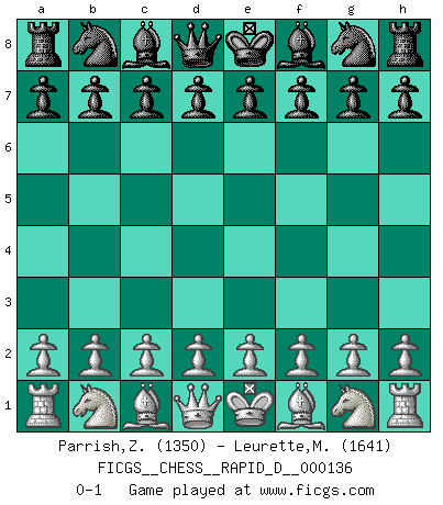 Last move : 0-1 2020 December 26 2:10:4 [Event "FICGS__CHESS__RAPID_D__000136"] [Site "FICGS"] [Date "2020.11.26"] [Round "1"] [White "Parrish,Zachary"] [Black "Leurette,Marc-Antoine"] [Result "0-1"] [WhiteElo "1350"] [BlackElo "1641"] 0-1 This chess game has been lost on time (started : 2020.11.26 1:44:10) Player Black won this chess game. Follow this game move after move (download)My style is somewhere between that of Tal and Petrosian. (Reshevsky) Charakterschwächen offenbaren sich normalerweise während einer Schachpartie. (Garry Kasparov) Cuando tu casa esta en llamas, no puedes ser molestado por tus vecinos. O, como decinos en Ajedrez, si tu Rey esta bajo ataque, no te preocupa perder un Peón del lado de la Reina. (Gary Kasparov) Mon pion favori sur ma case favorite ! Bronstein en parlant d'un coup de pion en h5 quand il avait les Noirs. You can think I'm wrong, but that's no reason to quit thinking. (Gregory House, House M.D.)