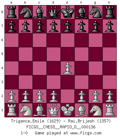 Last move : 1-0 2020 December 26 14:40:0 [Event "FICGS__CHESS__RAPID_D__000136"] [Site "FICGS"] [Date "2020.11.26"] [Round "1"] [White "Trigance,Emile"] [Black "Rai,Brijesh"] [Result "1-0"] [WhiteElo "1629"] [BlackElo "1357"] 1.e4 1-0 This chess game has been lost on time (started : 2020.11.26 1:44:10) King's pawn Opening Player White won this chess game. Follow this game move after move (download)When I have White, I win because I am white; When I have Black, I win because I am Bogolyubov. (Bogolyubov) Nur ein wirklich starker Spieler weiß wie schwach er spielt. (Savielly Grigorievitsch Tartakower) El Ajedrez es parte de la cultura, y si una cultura esta en decadencia, entonces también el Ajedrez declinará. (Mikhail Botvinnik) C'est la seule position que je connaisse où les deux camps sont mals. Propos prêtés à V. Anand. The best teachers teach from the heart, not from the book. (Author unknown)