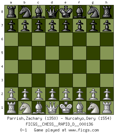 Last move : 0-1 2020 December 26 2:10:4 [Event "FICGS__CHESS__RAPID_D__000136"] [Site "FICGS"] [Date "2020.11.26"] [Round "1"] [White "Parrish,Zachary"] [Black "Nurcahyo,Dery"] [Result "0-1"] [WhiteElo "1350"] [BlackElo "1554"] 0-1 This chess game has been lost on time (started : 2020.11.26 1:44:10) Player Black won this chess game. Follow this game move after move (download)The game of Chess is not merely an idle amusement; several very valuable qualities of the mind are to be acquired and strengthened by it, so as to become habits ready on all occasions; for life is a kind of Chess. (Benjamin Franklin) Obendrein hat der FIDE-Präsident den Revolutionsführer Gaddafi zum »Großmeister« ernannt, am Ende der WM. Das ist lächerlich! (Joel Lautier) Un juego de Ajedrez es un dialogo, una conversación entre un jugador y su oponente. Cada movimiento del oponente puede contener amenazas o tropiezos, pero un jugador no se puede defender de las amenazas o tomar ventaja de los tropiezos si es que no se pregunta a sí mismo: ¿Que es lo que mi oponente va a hacer después de cada movida?. (Bruce A. Moon) Il (Jacob Murray) ne joue pas pour le bon coup, mais pour le meilleur. (Eloi Relange) I just play for fun. (Anna Kournikova)