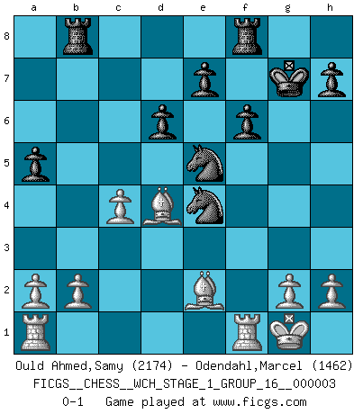 Last move : 0-1 2007 October 25 10:41:42 [Event "FICGS__CHESS__WCH_STAGE_1_GROUP_16__000003"] [Site "FICGS"] [Date "2007.07.11"] [Round "1"] [White "Ould Ahmed,Samy"] [Black "Odendahl,Marcel"] [Result "0-1"] [WhiteElo "2174"] [BlackElo "1462"] 1.e4 c5 2.Nf3 g6 3.d4 Bg7 4.c4 Qb6 5.dxc5 Qxc5 6.Be2 d6 7.O-O Nc6 8.Nfd2 Nf6 9.Nb3 Qe5 10.f3 O-O 11.Nc3 b6 12.Be3 Bb7 13.Qd2 Rad8 14.Nb5 Nd7 15.N3d4 a5 16.f4 Qf6 17.f5 Nc5 18.fxg6 Qxg6 19.Nf5 Kh8 20.Nxg7 Kxg7 21.Nc3 Ne5 22.Qd4 Bxe4 23.Nxe4 Qxe4 24.Qxe4 Nxe4 25.Bxb6 Rb8 26.Bd4 f6 0-1 Sicilian : Hungarian variation Kingside Castling by player White (move 7) Kingside Castling by player Black (move 10) Player Black won this chess game. Follow this game move after move (download)Chess is a beautiful mistress. (Bent Larsen) Schachspieler können ausgezeichnet Varianten am Schachbrett berechnen, aber nicht im realen Leben. Zu stark ist der Individualismus im Schach ausgeprägt, und für viele ist ein kleiner momentaner persönlicher Vorteil wichtiger als ein weit größerer Vorteil von morgen. (Anatoly Karpov) Los Peones son nacidos libres, y aún así, se encuentran encadenados por todos lados. (Rick Kennedy) Shah mat. Le roi est mort. Cri de fierté d'un joueur venant de terrasser son adversaire, courtoisement, sans effusion de sang. A journey of a thousand sites begins with a single click. (Author unknown)