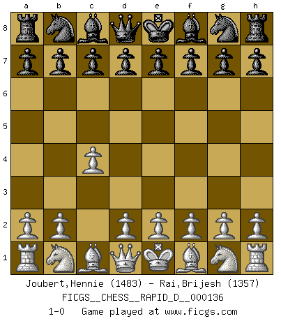 Last move : 1-0 2020 December 26 2:10:4 [Event "FICGS__CHESS__RAPID_D__000136"] [Site "FICGS"] [Date "2020.11.26"] [Round "1"] [White "Joubert,Hennie"] [Black "Rai,Brijesh"] [Result "1-0"] [WhiteElo "1483"] [BlackElo "1357"] 1.c4 1-0 This chess game has been lost on time (started : 2020.11.26 1:44:10) English Opening Player White won this chess game. Follow this game move after move (download)A man that will take back a move at Chess will pick a pocket. (Richard Fenton) Man braucht nicht immer den besten Zug zu spielen: Ein Zug muß aktiv, unternehmungslustig, korrekt und schön sein. (David Bronstein) Ciertamente el estado mental actual de Bobby Fischer es una tragedia. Uno de los mas grandes jugadores de Ajedrez del mundo -el orgullo y pena del Ajedrez Americano. (Frank Brady) Les échecs sont un jeu terrible. Si vous n'avez pas le centre, votre adversaire a une position plus libre. Par contre, si vous avez le centre, alors vous avez vraiment quelque chose pour laquelle vous inquiéter ! (Siegbert Tarrasch) God is an atheist. (Unknown)