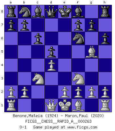 Last move : 0-1 2021 January 14 16:13:40 [Event "FICGS__CHESS__RAPID_A__000263"] [Site "FICGS"] [Date "2020.11.26"] [Round "1"] [White "Benone,Mateia"] [Black "Maron,Paul"] [Result "0-1"] [WhiteElo "1924"] [BlackElo "2020"] 1.Nf3 Nf6 2.c4 e6 3.Nc3 d5 4.cxd5 exd5 5.d4 c6 6.Bg5 h6 0-1 This chess game has been lost on time (started : 2020.11.26 10:6:16) Reti Opening Player Black won this chess game. Follow this game move after move (download)Chess, like any creative activity, can exist only through the combined efforts of those who have creative talent, and those who have the ability to organize their creative work. (Mikhail Botvinnik) Bis jetzt ist Weiß einer wohlbekannten Analyse gefolgt. Aber jetzt begeht er einen schrecklichen Fehler: Er beginnt seinen eigenen Kopf zu benutzen. (Siegbert Tarrasch) Tu eres para mi la Reina en d8 y yo soy el Peón en d7!!. (GM Eduard Gufeld) La guerre est enfant de la passion, la passion est enfant du narcissisme et le narcissisme est l'enfant. (...) Une autre partie ? (Thibault de Vassal) There is a very easy way to return from a casino with a small fortune : go there with a large one. (Jack Yelton)