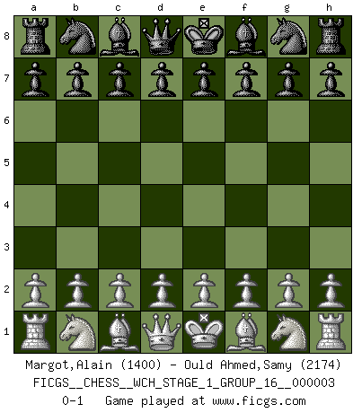 Last move : 0-1 2007 August 10 21:3:22 [Event "FICGS__CHESS__WCH_STAGE_1_GROUP_16__000003"] [Site "FICGS"] [Date "2007.07.11"] [Round "1"] [White "Margot,Alain"] [Black "Ould Ahmed,Samy"] [Result "0-1"] [WhiteElo "1400"] [BlackElo "2174"] 0-1 This chess game has been lost on time (started : 2007.07.11 17:18:48) Player Black won this chess game. Follow this game move after move (download)Excellence at Chess is one mark of a scheming mind. (Sir Arthur Conan Doyle) Im Internet Chess Club betrug mein Rating vorübergehend 3350 ELO-Punkte. (Sergej Karjakin) Cuando tengas duda... ¡juega al Ajedrez!. (Tevis) J'apprécie les joueurs d'est-indienne, c'est grâce à eux que je nourris ma famille depuis tant d'années. (Petrosian) Fortune favours the audacious. (Desiderius Erasmus)