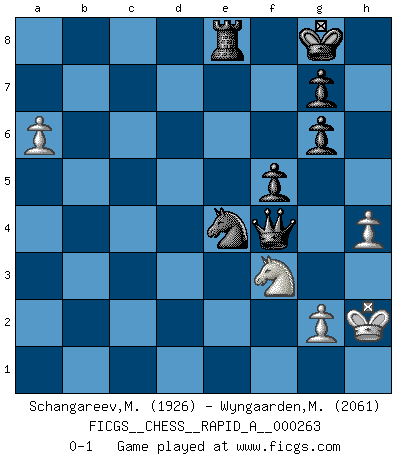 Last move : 0-1 2020 December 23 1:10:3 [Event "FICGS__CHESS__RAPID_A__000263"] [Site "FICGS"] [Date "2020.11.26"] [Round "1"] [White "Schangareev,Mirzian"] [Black "Wyngaarden,Martin"] [Result "0-1"] [WhiteElo "1926"] [BlackElo "2061"] 1.e4 c6 2.d4 d5 3.Nd2 dxe4 4.Nxe4 Bf5 5.Ng3 Bg6 6.Nf3 Nd7 7.Bd3 Ngf6 8.Bxg6 hxg6 9.O-O e6 10.Bg5 Be7 11.Qe2 O-O 12.Rfe1 Qc7 13.c4 Rfe8 14.a3 a5 15.Qc2 c5 16.Ne2 Rac8 17.Rac1 Qb6 18.h3 Qa6 19.a4 cxd4 20.Nexd4 e5 21.Nb5 e4 22.Nd2 Bb4 23.Re2 Nc5 24.Rd1 Qe6 25.Be3 b6 26.b3 Red8 27.Bxc5 Bxc5 28.Nc3 e3 29.fxe3 Bb4 30.Rc1 Rd7 31.Nf3 Nh5 32.Nd4 Qe5 33.Nf3 Qe7 34.R2e1 f5 35.Nd5 Rxd5 36.Qb2 Bxe1 37.Rxe1 Rd3 38.Ne5 Rd6 39.Nf3 Re6 40.Qd4 Rd8 41.Qc3 Re8 42.c5 bxc5 43.Qxa5 Rxe3 44.Rxe3 Qxe3+ 45.Kh2 Nf6 46.Qd2 Qxb3 47.Qf4 Re2 48.Ng5 c4 49.Qf1 Qe3 50.Qf3 c3 51.Qa8+ Qe8 52.Qxe8+ Rxe8 53.Nf3 c2 54.a5 c1Q 55.a6 Ne4 56.h4 Qf4+ 0-1 Caro-Kann : 3.Nd2 Kingside Castling by player White (move 9) Kingside Castling by player Black (move 11) Promotion Queen by player Black (move 54) Player Black won this chess game. Follow this game move after move (download)I have never in my life played the French Defence, which is the dullest of all openings. (Wilhelm Steinitz) Spiel ein langweiliges Spiel zu Ende und lustige Dinge können passieren. (Hans Ree) El Ajedrez es parte de una cultura y si una cultura esta en decadencia, entonces también el Ajedrez declinará. (Mikhail Botvinnik) Les échecs, c'est l'art d'analyser. (Mikhail Botvinnik) Winning isn't everything... but losing is nothing. (Mednis)