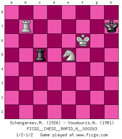 Last move : 1/2-1/2 2020 December 23 16:3:42 [Event "FICGS__CHESS__RAPID_A__000263"] [Site "FICGS"] [Date "2020.11.26"] [Round "1"] [White "Schangareev,Mirzian"] [Black "Voudouris,Nick"] [Result "1/2-1/2"] [WhiteElo "1926"] [BlackElo "1981"] 1.e4 Nf6 2.e5 Nd5 3.d4 d6 4.Nf3 dxe5 5.Nxe5 c6 6.Nf3 Bf5 7.a3 e6 8.c4 Nf6 9.Nc3 Bd6 10.Bg5 Nbd7 11.Bd3 h6 12.Bh4 Bg4 13.Bc2 O-O 14.h3 Bf5 15.c5 Bxc2 16.Qxc2 Bc7 17.O-O Qb8 18.Bxf6 Nxf6 19.b4 b5 20.a4 a5 21.axb5 axb4 22.Rxa8 Qxa8 23.Na2 cxb5 24.Rb1 Nd5 25.Nxb4 Nf4 26.Kf1 Rc8 27.Rb2 Bd8 28.Ra2 Qb7 29.Ra6 Bf6 30.Rb6 Qa8 31.Ra6 Qb7 32.Qb1 g5 33.Rb6 Qa8 34.Ra6 Qb7 35.c6 Qc7 36.g3 Nxh3 37.Qe4 Qd6 38.d5 Bc3 39.Nc2 b4 40.Nfd4 Qc5 41.dxe6 Bxd4 42.Nxd4 f5 43.Qe3 Qc4+ 44.Kg2 Nxf2 45.e7 Ne4 46.Ra7 Re8 47.Rd7 Kf7 48.c7 Rxe7 49.Qb3 Qxb3 50.Nxb3 Nd6 51.Rxd6 Rxc7 52.Nd4 h5 53.Rb6 f4 54.gxf4 Rc4 55.Nf3 Rxf4 56.Ne5+ Kg7 57.Rg6+ Kf8 58.Rxg5 Ke7 59.Rxh5 Kd6 60.Nf3 Kc6 61.Ne5+ Kd6 62.Nf3 Kc6 63.Kf2 b3 64.Ke3 b2 65.Rh1 Ra4 66.Rb1 Ra3+ 67.Ke2 Ra2 68.Nd2 Kc5 69.Kd3 Kb4 70.Kd4 Kb5 71.Nc4 Kc6 72.Nxb2 Kd7 73.Nc4 Ke6 74.Rb6+ Kf5 75.Rb1 Ke6 76.Rh1 Rf2 77.Ke4 Kf6 78.Ra1 Kg6 79.Ne5+ Kg5 80.Rg1+ Kh5 81.Rh1+ Kg5 82.Nf3+ Kf6 83.Rh6+ Kg7 84.Rd6 Kf8 85.Rd7 Re2+ 86.Kd3 Re7 87.Rd6 Ra7 88.Rh6 Kg7 89.Rb6 Ra4 90.Ne5 Ra5 91.Kd4 Ra1 92.Kd5 Rd1+ 93.Ke6 Rf1 94.Rb7+ Kg8 95.Rb3 Kf8 96.Rg3 Re1 97.Rg2 Re3 98.Rb2 Ra3 99.Nd7+ Kg7 100.Rg2+ Kh6 101.Ne5 Ra6+ 102.Kf5 Ra5 103.Rg8 Kh7 104.Rc8 Kg7 105.Rc7+ Kh6 106.Re7 Rc5 107.Rb7 Ra5 108.Rb8 Rc5 109.Kf6 Kh7 110.Rb7+ Kh6 111.Rb3 Kh7 112.Rb7+ Kh6 113.Rb8 Kh7 114.Rb7+ 1/2-1/2 Alekhine's defense : Modern, Larsen variation Kingside Castling by player Black (move 13) Kingside Castling by player White (move 17) 10 pieces endgame at move 51 : White KRNP , Black KRPPPP WHITE : King + 1 Rook 1 Knight 1 Pawn BLACK : King + 1 Rook 4 Pawns 9 pieces endgame at move 54 : White KRNP , Black KRPPP WHITE : King + 1 Rook 1 Knight 1 Pawn BLACK : King + 1 Rook 3 Pawns 8 pieces endgame at move 55 : White KRN , Black KRPPP WHITE : King + 1 Rook 1 Knight BLACK : King + 1 Rook 3 Pawns 7 pieces endgame at move 58 : White KRN , Black KRPP WHITE : King + 1 Rook 1 Knight BLACK : King + 1 Rook 2 Pawns 6 pieces endgame at move 59 : White KRN , Black KRP WHITE : King + 1 Rook 1 Knight BLACK : King + 1 Rook 1 Pawn 5 pieces endgame at move 72 : White KRN , Black KR WHITE : King + 1 Rook 1 Knight BLACK : King + 1 Rook This chess game ended in a draw. Follow this game move after move (download)Bobby Fischer is the greatest Chess genius of all time ! (Alexander Kotov) Schach ist ein schwarz-weisser Dschungel. (Garry Kasparov) Cuando me preguntan: -¿Cual es el secreto que te hace hacer mejores movidas que tus oponentes?, Yo respondo: Me da gusto que me pregunten eso, porque, como veran, hay una simple razón. Yo pienso mis propias movidas y dejo a mi oponente que el piense las suyas. (Alexander Alekhine) Les sacrifices démontrent seulement que quelqu'un a gaffé. (Savielly Tartacover) Lamb in skin of tiger, still fears the wolf. (Chinese proverb)