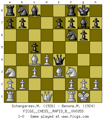 Last move : 1-0 2021 January 13 13:35:13 [Event "FICGS__CHESS__RAPID_B__000355"] [Site "FICGS"] [Date "2020.11.26"] [Round "1"] [White "Schangareev,Mirzian"] [Black "Benone,Mateia"] [Result "1-0"] [WhiteElo "1926"] [BlackElo "1924"] 1.e4 c5 2.Nf3 g6 3.c3 d5 4.exd5 Qxd5 5.d4 Bg7 6.Na3 Nf6 7.Bc4 Qe4+ 8.Be3 O-O 9.O-O 1-0 This chess game has been lost on time (started : 2020.11.26 10:6:46) Sicilian : Hungarian variation Kingside Castling by player Black (move 8) Kingside Castling by player White (move 9) Player White won this chess game. Follow this game move after move (download)Chess demands total concentration. (Bobby Fischer) Konzentriere dich auf materielle Gewinne. Nimm, was dir dein Gegner gibt, ausser es gibt einen guten Grund der dagegenspricht. (Robert James Fischer) Estaba muy claro de que el punto vulnerable del Gran Maestro Americano (Bobby Fischer) radicaba en las posiciones de doble filo, colgantes, irracionales, donde el siempre falló en encontrar un triunfo aún en una posición de clara victoria. (Efim Geller) L'attaque fait le spectacle, la défense gagne les matchs. (Dicton footballistique) Gambling is the son of avarice and the father of despair. (French proverb)