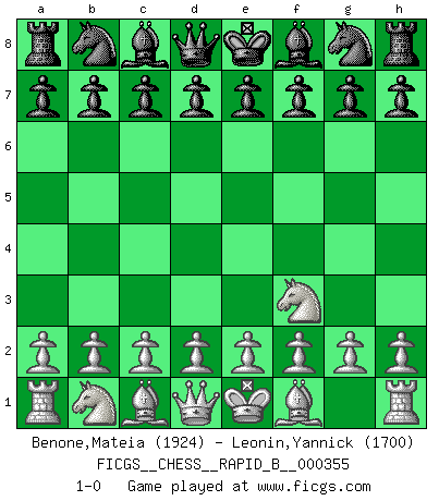 Last move : 1-0 2020 December 27 2:43:1 [Event "FICGS__CHESS__RAPID_B__000355"] [Site "FICGS"] [Date "2020.11.26"] [Round "1"] [White "Benone,Mateia"] [Black "Leonin,Yannick"] [Result "1-0"] [WhiteElo "1924"] [BlackElo "1700"] 1.Nf3 1-0 This chess game has been lost on time (started : 2020.11.26 10:6:46) Reti Opening Player White won this chess game. Follow this game move after move (download)The sign of a great Master is his ability to win a won game quickly and painlessly. (Irving Chernev) Der 70jährige Viktor Kortschnoi: Die Rentenanstalt wollte mich zwingen in Rente zu gehen. Meine Frau erhält jetzt eine Pension- und ich zahle weiter in die Rentenkasse ein! (Viktor Kortschnoi) En el Ajedrez, tal como es jugado por los Maestros, practicamente la suerte es eliminada. (Emanuel Lasker) Toute estimation doit être constamment réévaluée. (Jacob Estrin) If we don't succeed, we run the risk of failure. (George W. Bush)