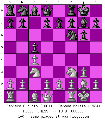 Last move : 1-0 2021 January 11 10:24:21 [Event "FICGS__CHESS__RAPID_B__000355"] [Site "FICGS"] [Date "2020.11.26"] [Round "1"] [White "Cabrera,Claudio"] [Black "Benone,Mateia"] [Result "1-0"] [WhiteElo "1881"] [BlackElo "1924"] 1.Nf3 c5 2.c4 Nf6 3.g3 g6 4.Bg2 Bg7 5.Nc3 O-O 6.O-O 1-0 This chess game has been lost on time (started : 2020.11.26 10:6:46) Reti Opening Kingside Castling by player Black (move 5) Kingside Castling by player White (move 6) Player White won this chess game. Follow this game move after move (download)There are two classes of men; those who are content to yield to circumstances and who play whist; those who aim to control circumstances, and who play Chess. (Mortimer Collins) Ein unbeabsichtigtes Patt ist der Gipfel der Dummheit. (Anonymous) El poder defensivo de una pieza clavada, solamente es imaginario. (Aaron Nimzovich) Les Echecs ne sont pas pour les âmes timides. Ils requièrent un homme entier, qui ne s'arrête pas aveuglément à ce qui a été déjà établi, mais qui tente individuellement de sonder les profondeurs du jeu. (W. Steinitz) It is the aim of the modern school, not to treat every position according to one general law, but according to the principle inherent in the position. (Richard Reti)