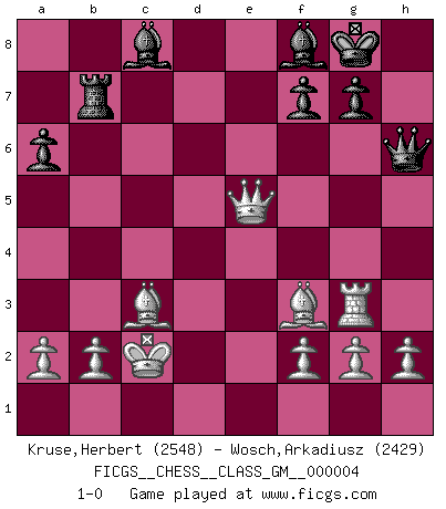 Last move : 1-0 2021 April 14 19:4:39 [Event "FICGS__CHESS__CLASS_GM__000004"] [Site "FICGS"] [Date "2020.11.26"] [Round "1"] [White "Kruse,Herbert"] [Black "Wosch,Arkadiusz"] [Result "1-0"] [WhiteElo "2548"] [BlackElo "2429"] 1.e4 c5 2.Nf3 Nc6 3.d4 cxd4 4.Nxd4 Nf6 5.Nc3 d6 6.Bg5 e6 7.Qd2 a6 8.Nxc6 bxc6 9.O-O-O h6 10.Bf4 d5 11.Qe3 Bb4 12.Be2 O-O 13.e5 Nd7 14.Qg3 Qc7 15.Na4 Re8 16.Bh5 Ra7 17.Rd3 Rb7 18.Re3 Bf8 19.Bxh6 c5 20.Rf3 Nxe5 21.Bf4 Nd3+ 22.cxd3 e5 23.Bd2 Qc6 24.Nc3 c4 25.Re1 d4 26.Rxe5 Rxe5 27.Qxe5 dxc3 28.Bxc3 cxd3 29.Rxd3 Rd7 30.Rg3 Qh6+ 31.Kc2 Rb7 32.Bf3 1-0 Sicilian defense Queenside Castling by player White (move 9) Kingside Castling by player Black (move 12) Player White won this chess game. Follow this game move after move (download)Chess is imagination. (David Bronstein) Ich weiss nicht was Gott gegen mich auf 1.e4 antworten würde. (Robert James Fischer) El Ajedrez es despiadado: debes de estar preparado para matar gente. (Nigel Short) Les réformistes prétendent que les progrès de la théorie conduiront à la disparition des échecs, et qu'il faut, pour leur rendre vie, en remanier les règles. En réalité, qu'exprime cette affirmation? Le mépris de l'intuition, de l'imagination et de tous les autres éléments qui font des échecs un art. (Alexander Alekhine) Train yourself to let go of everything you fear to lose. (Master Yoda in Star Wars ep.3)