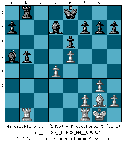 Last move : 1/2-1/2 2020 December 26 20:52:39 [Event "FICGS__CHESS__CLASS_GM__000004"] [Site "FICGS"] [Date "2020.11.26"] [Round "1"] [White "Marciz,Alexander"] [Black "Kruse,Herbert"] [Result "1/2-1/2"] [WhiteElo "2455"] [BlackElo "2548"] 1.Nf3 Nf6 2.c4 c5 3.Nc3 Nc6 4.g3 d5 5.d4 e6 6.cxd5 Nxd5 7.Bg2 cxd4 8.Nxd4 Nxc3 9.bxc3 Nxd4 10.Qxd4 Qxd4 11.cxd4 Bd6 12.a4 Rb8 13.a5 Ke7 14.e4 Bd7 15.O-O Rhc8 16.e5 Bb4 17.Rb1 Bxa5 18.Ba3+ Ke8 19.Bd6 b5 20.Bxb8 Rxb8 1/2-1/2 Reti Opening Kingside Castling by player White (move 15) This chess game ended in a draw. Follow this game move after move (download)I have always a slight feeling of pity for the man who has no knowledge of Chess. (Siegbert Tarrasch) Kasparov ist eine Art Monster mit hundert Augen, denen auch nicht das Geringste entgeht. (Tony Miles) El poder defensivo de una pieza clavada, solamente es imaginario. (Aaron Nimzovich) Le système Elo représente seulement une moyenne. Il est simplement un indicateur de votre stabilité. (Anatoli Karpov) The weakness of an artist is dogma. (Josh Waitzkin)