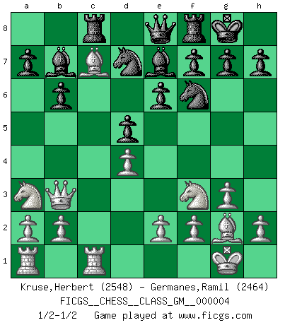 Last move : 1/2-1/2 2021 February 28 13:55:1 [Event "FICGS__CHESS__CLASS_GM__000004"] [Site "FICGS"] [Date "2020.11.26"] [Round "1"] [White "Kruse,Herbert"] [Black "Germanes,Ramil"] [Result "1/2-1/2"] [WhiteElo "2548"] [BlackElo "2464"] 1.d4 Nf6 2.c4 e6 3.g3 d5 4.Nf3 Bb4+ 5.Bd2 Be7 6.Bg2 O-O 7.O-O c6 8.Qc2 Nbd7 9.Bf4 b6 10.cxd5 cxd5 11.Rc1 Bb7 12.Bc7 Qe8 13.Qb3 Rc8 14.Na3 1/2-1/2 Catalan Opening Kingside Castling by player Black (move 6) Kingside Castling by player White (move 7) This chess game ended in a draw. Follow this game move after move (download)In Fischer's hands, a slight theoretical advantage is as good a being a Queen ahead. (Isaac Kashdan) Kasparov stellt für gewöhnlich die Regeln auf und bricht sie dann selbst wieder. (Alexej Shirov) Hay jugadores fuertes y personas amables y yo soy un jugador fuerte. (Bobby Fischer) Dans le domaine de la peinture, de la gravure et de la sculpture, dès la première décennie de notre siècle, les artistes abandonnent la représentation de la partie d'échecs pour se concentrer sur les pièces, sur les échiquiers et sur toutes les variations auxquelles les unes et les autres peuvent donner lieu. On passe en quelque sorte d'un thème social à un thème musical (au sens de la musica médiévale, c'est-à-dire d'une notion qui inclue le rythme, l'harmonie, la construction et la déconstruction, etc.). Graphiquement et picturalement, l'échiquier apparaît comme une structure ouverte, dynamique, d'une richesse infinie, autorisant toutes les combinatoires et débouchant sur des mouvements et des rythmes de nature exponentielle. (Michel Pastoureau) Mandala - that's it! 16x16 squares as multiple of the four and the eight because of the Four Noble Truths and the Noble Eightfold Path. (Heinz-Georg Lehnhoff about Big Chess)