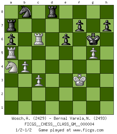 Last move : 1/2-1/2 2021 June 11 19:10:22 [Event "FICGS__CHESS__CLASS_GM__000004"] [Site "FICGS"] [Date "2020.11.26"] [Round "1"] [White "Wosch,Arkadiusz"] [Black "Bernal Varela,Nelson"] [Result "1/2-1/2"] [WhiteElo "2429"] [BlackElo "2493"] 1.e4 e6 2.d4 d5 3.Nc3 Nf6 4.Bg5 dxe4 5.Nxe4 Be7 6.Bxf6 gxf6 7.Nf3 f5 8.Nc3 a6 9.g3 b5 10.Bg2 Bb7 11.O-O c5 12.dxc5 Qxd1 13.Raxd1 Bxc5 14.Rfe1 Ra7 15.a3 Be7 16.Ne5 Bxg2 17.Kxg2 Rc7 18.Rd2 Bg5 19.f4 Bf6 20.R1e2 Nd7 21.Rd6 Bxe5 22.fxe5 Nb8 23.Rb6 O-O 24.a4 bxa4 25.Nxa4 Nc6 26.c3 Ra8 27.h3 Ne7 28.Rd2 Ng6 29.R2d6 Rca7 30.Rbc6 Nxe5 31.Rc5 Nd7 32.Ra5 Kf8 33.g4 Ke7 34.Rc6 fxg4 35.hxg4 Kf6 36.g5+ Kg6 37.b4 Rd8 38.Kf3 Nb8 39.Rb6 Nd7 40.Rc6 Nb8 1/2-1/2 French : Burn variation Kingside Castling by player White (move 11) Kingside Castling by player Black (move 23) This chess game ended in a draw. Follow this game move after move (download)A man without frontiers. He didn't divide the East and the West, he brought them together in their admiration for him. (Ljubomir Ljubojevic, about Bobby Fischer's death) Ja, ich habe einmal eine Blitzpartie gespielt, es war in einem Zug, 1929. --im Interview 1989 (Mikhail Moiseyevich Botvinik) El Ajedrez moderno está demasiado preocupado con cosas como la estructura de Peones. Olvidenlo, el Jaque Mate termina la partida. (Nigel Short) Les échecs, c'est l'art d'analyser. (Mikhail Botvinnik) They say in chess you've got to kill the queen, and then you mate it... Oh I, do you ? (Red Hot Chili Peppers, Fortune faded)