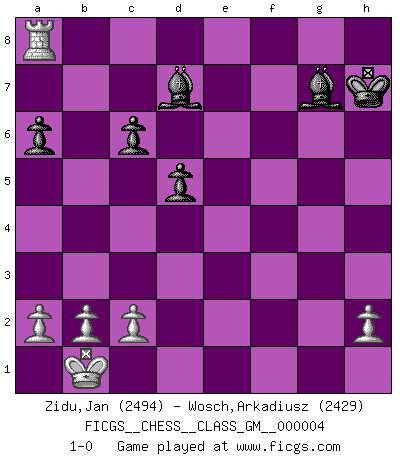 Last move : 1-0 2021 June 3 19:8:26 [Event "FICGS__CHESS__CLASS_GM__000004"] [Site "FICGS"] [Date "2020.11.26"] [Round "1"] [White "Zidu,Jan"] [Black "Wosch,Arkadiusz"] [Result "1-0"] [WhiteElo "2494"] [BlackElo "2429"] 1.e4 c5 2.Nf3 Nc6 3.d4 cxd4 4.Nxd4 Nf6 5.Nc3 d6 6.Bg5 e6 7.Qd2 a6 8.Nxc6 bxc6 9.O-O-O h6 10.Bf4 d5 11.Qe3 Bb4 12.Be2 O-O 13.e5 Nd7 14.Qg3 Kh8 15.Qh3 Kh7 16.Bd3+ Kg8 17.Ne2 Qc7 18.Bxh6 gxh6 19.Qxh6 f5 20.g4 Nxe5 21.gxf5 Qh7 22.Rhg1+ Kh8 23.Qe3 Bd6 24.fxe6 Qh4 25.f4 Rxf4 26.e7 Bd7 27.Nxf4 Qxf4 28.Qxf4 Nxd3+ 29.Rxd3 Bxf4+ 30.Kb1 Bd6 31.Rg6 Bxe7 32.Rdg3 Bf8 33.Rg8+ Kh7 34.R3g7+ Bxg7 35.Rxa8 1-0 Sicilian defense Queenside Castling by player White (move 9) Kingside Castling by player Black (move 12) Player White won this chess game. Follow this game move after move (download)The passed Pawn is a criminal, who should be kept under lock and key. Mild measures, such as police surveillance, are not sufficient. (Aaron Nimzovich) Wer mein Gambit spielt, muß bereit sein, alle Brücken hinter sich abzubrechen. Es verändert den ganzen Menschen. Es wirkt wie ein Zauberstab und fördert verkümmerte, gute Charakter- eigenschaften wieder zu Tage. (Emil Joseph Diemer) Realmente no sabemos como el juego fue inventado, aunque hay sospechas. Tan pronto como descubramos a los culpables, se los haremos saber. (Bruce Pandolfini) À la honte des hommes, on sait que les lois du jeu sont les seules qui soient partout justes, claires, inviolables et exécutées. Pourquoi l'Indien qui a donné les règles du jeu d'échecs est-il obéi de bon gré dans toute la terre, et que les décrétales des papes, par exemple, sont aujourd'hui un objet d'horreur et de mépris ? C'est que l'inventeur des échecs combina tout avec justesse pour la satisfaction des joueurs, et que les papes, dans leurs décrétales, n'eurent en vue que leur seul avantage. L'Indien voulut exercer également l'esprit des hommes et leur donner du plaisir; les papes ont voulu abrutir l'esprit des hommes. Voltaire (Dictionnaire philosophique / Garnier 1967) In theory there is no difference between theory and practice. In practice there is. (Yogi Berra)