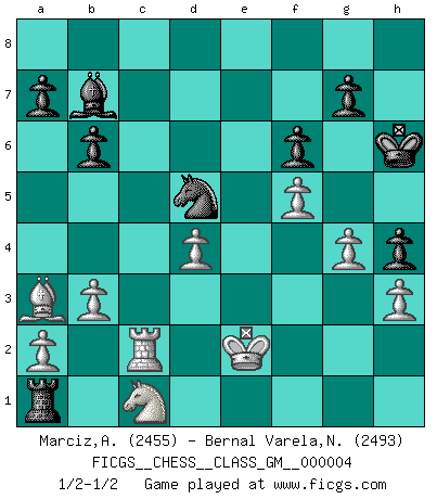 Last move : 1/2-1/2 2021 April 4 14:23:29 [Event "FICGS__CHESS__CLASS_GM__000004"] [Site "FICGS"] [Date "2020.11.26"] [Round "1"] [White "Marciz,Alexander"] [Black "Bernal Varela,Nelson"] [Result "1/2-1/2"] [WhiteElo "2455"] [BlackElo "2493"] 1.Nf3 e6 2.c4 d5 3.d4 c6 4.e3 Nd7 5.b3 Ngf6 6.Bb2 b6 7.Bd3 Bd6 8.O-O Bb7 9.Nc3 O-O 10.Qc2 Re8 11.Rad1 Qe7 12.Rfe1 Bb4 13.Re2 Nf8 14.Nb1 Ng6 15.cxd5 exd5 16.Rc1 Bd6 17.Nbd2 Ne4 18.Nf1 Nh4 19.N3d2 Qg5 20.f4 Qg6 21.Bxe4 dxe4 22.Ng3 Rad8 23.Nc4 Ba6 24.Rd2 Nf5 25.Nxd6 Nxe3 26.Qxc6 Qxd6 27.Qxd6 Rxd6 28.Re1 Nd5 29.Rxe4 Rde6 30.Rxe6 Rxe6 31.f5 Re1+ 32.Kf2 Rb1 33.Ba3 h6 34.h3 Ra1 35.Ne2 h5 36.g4 Bb7 37.Rc2 h4 38.Nc1 Kh7 39.Ke1 f6 40.Ke2 Kh6 1/2-1/2 Reti Opening Kingside Castling by player White (move 8) Kingside Castling by player Black (move 9) This chess game ended in a draw. Follow this game move after move (download)No price is too great for the scalp of the enemy King. (Koblentz) Der Partner hat auch seine Existenzberechtigung. (Savielly Grigorievitsch Tartakower) El Ajedrez expande y enriquece tu mente. (Saudin Robovic) La vie est comme un jeu d'échecs : nous esquissons un plan, mais celui-ci est tributaire de ce que daignent faire l'adversaire aux échecs et le destin dans la vie. (Arthur Schopenhauer) Ah, beer! The cause of, and the solution to, all of life's problems. (Homer Simpson)