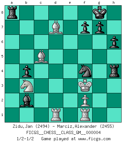 Last move : 1/2-1/2 2021 January 25 10:15:21 [Event "FICGS__CHESS__CLASS_GM__000004"] [Site "FICGS"] [Date "2020.11.26"] [Round "1"] [White "Zidu,Jan"] [Black "Marciz,Alexander"] [Result "1/2-1/2"] [WhiteElo "2494"] [BlackElo "2455"] 1.d4 d5 2.Nf3 Nf6 3.c4 e6 4.Nc3 c6 5.e3 Nbd7 6.Qc2 Bd6 7.Bd3 O-O 8.O-O dxc4 9.Bxc4 b5 10.Bd3 Bb7 11.a3 Re8 12.h3 e5 13.Bd2 h6 14.Rad1 exd4 15.exd4 a6 16.b4 a5 17.bxa5 Bxa3 18.Ne5 b4 19.Nxd7 Qxd7 20.Na4 Qxd4 21.Be3 Qh4 22.Qc5 Qh5 23.Qxh5 Nxh5 24.Nc5 Bc8 25.Be4 Rxa5 26.Bxc6 Rf8 27.Nb3 Ra6 28.Bb5 Rg6 29.g4 Bb2 30.Bc5 Bxg4 31.hxg4 Rxg4+ 32.Kh1 Rh4+ 33.Kg2 Rb8 34.Bd7 Nf4+ 35.Kf3 Ra8 1/2-1/2 Queen's pawn game Kingside Castling by player Black (move 7) Kingside Castling by player White (move 8) This chess game ended in a draw. Follow this game move after move (download)A strong memory, concentration, imagination, and a strong will is required to become a great Chess player. (Bobby Fischer) Kostenjuk hat keinen Sexappeal. (Loek van Wely) El Ajedrez es despiadado: debes de estar preparado para matar gente. (Nigel Short) On peut tirer plus d'utilité d'une partie perdue que de 100 parties gagnées. (Capablanca) Hello Thibault, if I have had a plan (and I had one, I hope), I have forgotten it during the last week... - Hello Heinz-Georg. What do you mean a plan ? (Anonymous players, during a Big Chess game)