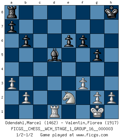 Last move : 1/2-1/2 2007 October 12 5:34:52 [Event "FICGS__CHESS__WCH_STAGE_1_GROUP_16__000003"] [Site "FICGS"] [Date "2007.07.11"] [Round "1"] [White "Odendahl,Marcel"] [Black "Valentin,Florea"] [Result "1/2-1/2"] [WhiteElo "1462"] [BlackElo "1917"] 1.c4 Nf6 2.Nf3 b6 3.Nc3 Bb7 4.d4 e6 5.a3 d5 6.cxd5 Nxd5 7.Qc2 c5 8.dxc5 Bxc5 9.Bg5 f6 10.Bd2 O-O 11.e4 Nxc3 12.Bxc3 Qc7 13.Rd1 Nd7 14.Bc4 Rfe8 15.O-O Bd6 16.Bb5 Red8 17.Rfe1 Kh8 18.Bxd7 Rxd7 19.e5 Be7 20.exf6 Bxf6 21.Rd3 Rxd3 22.Qxd3 Bd5 23.Nd4 Qc4 24.Qe3 h6 25.Ne2 Qg4 26.f3 Qg5 27.Qxg5 hxg5 28.Bxf6 gxf6 29.Rd1 1/2-1/2 English Opening Kingside Castling by player Black (move 10) Kingside Castling by player White (move 15) This chess game ended in a draw. Follow this game move after move (download)Any material change in a position must come about by mate, a capture, or a Pawn promotion. (Purdy) Die meiste Zeit treffe ich auf Gegner, die meine Enkel sein könnten. Ich bin da, um ihnen zu zeigen, dass sie von mir noch einiges lernen können. (Viktor Kortschnoi) Algunos sacrificios son sólidos, los demás son míos. (Mikhail Tal) D'abord les bases : Jouez et étudiez, puis étudiez et jouez, ensuite jouez et étudiez, puis étudiez et jouez. Deuxièmement : Donnez toujours le meilleur de vous-même ! (Ken Smith) Optimism is a variety of information deficit. Sometimes especially true for correspondence chess games. (Michael Aigner)