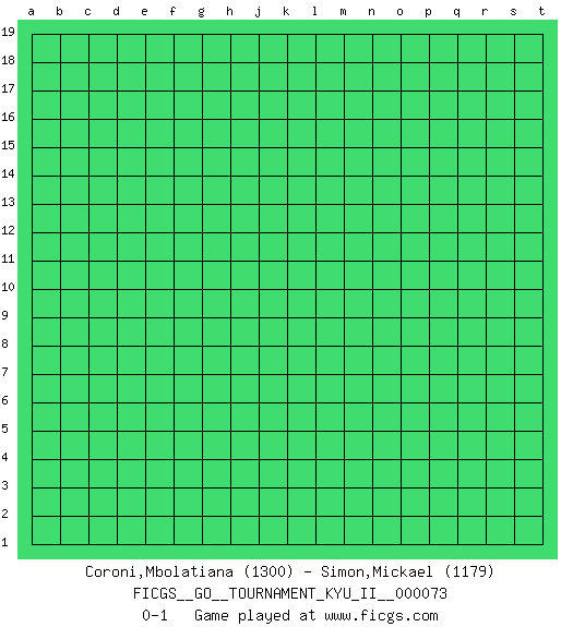 Last move : 0-1 2020 December 26 14:40:0 [Event "FICGS__GO__TOURNAMENT_KYU_II__000073"] [Site "FICGS"] [Date "2020.11.26"] [Round "1"] [Black "Coroni,Mbolatiana"] [White "Simon,Mickael"] [Result "0-1"] [Rating 1 "1300"] [Rating 2 "1179"] 0-1 This go game has been lost on time (started : 2020.11.26 13:25:51) Here are the names of the openings (joseki) played in the four corners : Player White won this Go (weiqi, baduk) game. Follow this game move after move (download)Use a wall to attack, not to make territory. (Anonymous) There are 10 types of people in this world: those who understand binary and those who don't. (Anonymous)
