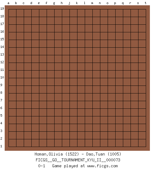 Last move : 0-1 2020 December 26 14:40:0 [Event "FICGS__GO__TOURNAMENT_KYU_II__000073"] [Site "FICGS"] [Date "2020.11.26"] [Round "1"] [Black "Homan,Olivia"] [White "Dao,Tuan"] [Result "0-1"] [Rating 1 "1522"] [Rating 2 "1005"] 0-1 This go game has been lost on time (started : 2020.11.26 13:25:51) Here are the names of the openings (joseki) played in the four corners : Player White won this Go (weiqi, baduk) game. Follow this game move after move (download)The nature of a game comes from what is played, but it's the sensitivity to the possible and the impossible that gives it value. (Pierre Audouard) The various flowers seem good to different people. (Chinese proverb)