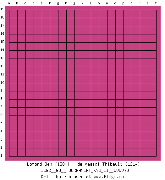 Last move : 0-1 2020 December 26 14:40:0 [Event "FICGS__GO__TOURNAMENT_KYU_II__000073"] [Site "FICGS"] [Date "2020.11.26"] [Round "1"] [Black "Lomond,Ben"] [White "de Vassal,Thibault"] [Result "0-1"] [Rating 1 "1500"] [Rating 2 "1214"] 0-1 This go game has been lost on time (started : 2020.11.26 13:25:51) Here are the names of the openings (joseki) played in the four corners : Player White won this Go (weiqi, baduk) game. Follow this game move after move (download)Connect with good shape. (Anonymous) A computer lets you make more mistakes faster than any invention in human history - with the possible exceptions of handguns and tequila. (Mitch Ratcliffe)
