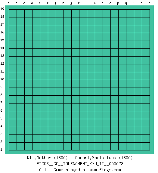 Last move : 0-1 2020 December 26 14:40:0 [Event "FICGS__GO__TOURNAMENT_KYU_II__000073"] [Site "FICGS"] [Date "2020.11.26"] [Round "1"] [Black "Kim,Arthur"] [White "Coroni,Mbolatiana"] [Result "0-1"] [Rating 1 "1300"] [Rating 2 "1300"] 0-1 This go game has been lost on time (started : 2020.11.26 13:25:51) Here are the names of the openings (joseki) played in the four corners : Player White won this Go (weiqi, baduk) game. Follow this game move after move (download)Proverbs do not apply to White. (Tero Sand) The obstacle is the path. (Zen proverb)