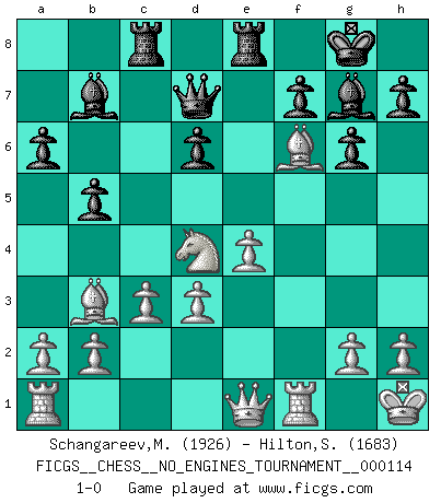 Last move : 1-0 2020 December 13 23:12:59 [Event "FICGS__CHESS__NO_ENGINES_TOURNAMENT__000114"] [Site "FICGS"] [Date "2020.11.26"] [Round "1"] [White "Schangareev,Mirzian"] [Black "Hilton,Stephen"] [Result "1-0"] [WhiteElo "1926"] [BlackElo "1683"] 1.e4 c5 2.Nc3 Nc6 3.Nf3 g6 4.Bb5 Bg7 5.O-O Nd4 6.Ba4 a6 7.Nxd4 cxd4 8.Ne2 b5 9.Bb3 Bb7 10.d3 Nf6 11.Nxd4 O-O 12.c3 d6 13.f4 e5 14.Nf3 Qb6+ 15.Kh1 exf4 16.Bxf4 Rad8 17.Qe1 Rfe8 18.Be3 Qc6 19.Nd4 Qd7 20.Bg5 Rc8 21.Bxf6 1-0 Sicilian : Closed, 2...Nc6 Kingside Castling by player White (move 5) Kingside Castling by player Black (move 11) Player White won this chess game. Follow this game move after move (download)To avoid losing a piece, many a person has lost the game. (Savielly Tartakover) Auf Remis zu spielen ist gewissermaßen ein Verbrechen gegen das Schachspiel. (Mikhail Nekhemyevich Tal) Muchos se han convertido en Maestros de Ajedrez, nadie se ha convertido en el Maestro del Ajedrez. (Siegbert Tarrasch) Des combinaisons [dans le jeu d'échecs] pareilles à des mélodies. Je crois entendre pour ainsi dire la musique des coups... (Vladimir Nabokov) The project of the man are lower than those of the sky. (Chinese proverb)