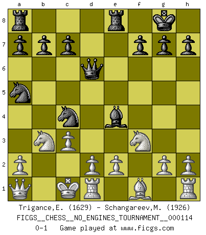 Last move : 0-1 2021 January 3 19:0:12 [Event "FICGS__CHESS__NO_ENGINES_TOURNAMENT__000114"] [Site "FICGS"] [Date "2020.11.26"] [Round "1"] [White "Trigance,Emile"] [Black "Schangareev,Mirzian"] [Result "0-1"] [WhiteElo "1629"] [BlackElo "1926"] 1.b4 e5 2.Bb2 Bxb4 3.f4 Nh6 4.fxe5 Ng4 5.c3 Be7 6.Nf3 d6 7.exd6 Bxd6 8.Qa4+ Nc6 9.Ba3 O-O 10.Bxd6 Qxd6 11.Qa3 Qh6 12.Qb2 Re8 13.Na3 Nge5 14.O-O-O Bf5 15.Nc2 Nc4 16.Qa1 N6a5 17.Ncd4 Be4 18.Nb3 Qd6 0-1 Polish (Sokolsky) opening Kingside Castling by player Black (move 9) Queenside Castling by player White (move 14) Player Black won this chess game. Follow this game move after move (download)My style is somewhere between that of Tal and Petrosian. (Reshevsky) Charakterschwächen offenbaren sich normalerweise während einer Schachpartie. (Garry Kasparov) La vida es como el Ajedrez, con lucha, competición y eventos buenos y malos. (Benjamin Franklin) Fischer est le meilleur joueur du monde et Karpov n'est qu'un joueur de bistrot. (Garry Kasparov, agé de 16 ans) Train yourself to let go of everything you fear to lose. (Master Yoda in Star Wars ep.3)