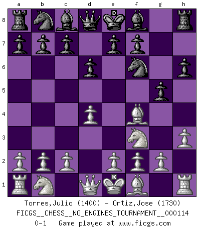 Last move : 0-1 2021 January 12 10:50:52 [Event "FICGS__CHESS__NO_ENGINES_TOURNAMENT__000114"] [Site "FICGS"] [Date "2020.11.26"] [Round "1"] [White "Torres,Julio"] [Black "Ortiz,Jose"] [Result "0-1"] [WhiteElo "1400"] [BlackElo "1730"] 1.d4 Nf6 2.Bf4 d6 3.Nf3 h6 4.h3 g5 0-1 This chess game has been lost on time (started : 2020.11.26 22:31:16) Queen's pawn game Player Black won this chess game. Follow this game move after move (download)I like to say that Bobby Fischer was the greatest player ever. But what made Fischer a genius was his ability to blend an American freshness and pragmatism with Russian ideas about strategy. (Bruce Pandolfini) Kann Schach nicht schließlich das Nationalspiel der Deutschen werden? Und welche weiteren Ausblicke bieten sich dann dar! Welche Hebung des allgemeinen Kultur-Niveaus, ja der Moral, wenn das Schachbrett den Kartentisch verdrängen würde! Wahrlich, ein Ziel, des Schweißes der Edlen wert! (Siegbert Tarrasch) Los Peones son nacidos libres, y aún así, se encuentran encadenados por todos lados. (Rick Kennedy) Vous m'avez demandé de vous exposer quel est le fondement de la prière. Je ne fais que préparer les pièces du jeu sur la table... Nous sera-t-il permis d'en adopter les règles et si nous les appliquons scrupuleusement nous ne tarderons pas à faire mat le Roi divin ! Il ne pourra échapper à nos mains. (Sainte Thérèse d'Avila, Chemin de perfection) Coffee just isn't my cup of tea. (Unknown)