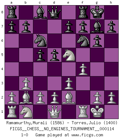 Last move : 1-0 2021 January 8 17:55:33 [Event "FICGS__CHESS__NO_ENGINES_TOURNAMENT__000114"] [Site "FICGS"] [Date "2020.11.26"] [Round "1"] [White "Ramamurthy,Murali"] [Black "Torres,Julio"] [Result "1-0"] [WhiteElo "1586"] [BlackElo "1400"] 1.f4 d5 2.Nf3 c5 3.b3 Nc6 4.Bb2 Nf6 5.e3 g6 6.Be2 Bg7 7.O-O O-O 8.Ne5 1-0 This chess game has been lost on time (started : 2020.11.26 22:31:16) Bird's Opening Kingside Castling by player White (move 7) Kingside Castling by player Black (move 7) Player White won this chess game. Follow this game move after move (download)A chess genius has died; a loss for humanity. (Viktor Kortchnoi, about Bobby Fischer's death) Ich moechte nie einem Club beitreten, der Leute wie mich als Mitglieder aufnimmt. (Woody Allen) Una clavada es mas poderosa que una espada. (Fred Reinfeld) Karpov est une pièce de musée. (Garry Kasparov) Those who make the worst use of their time are the first to complain of its brevity. (Jean de la Bruyere)