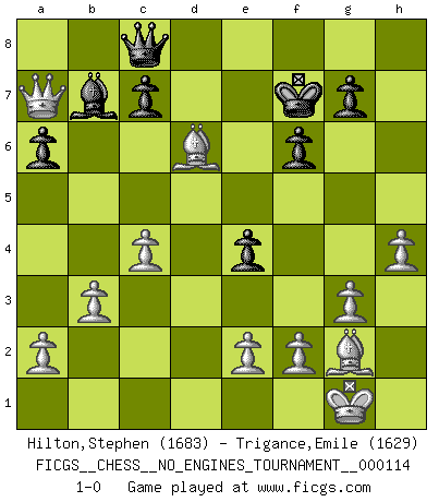 Last move : 1-0 2021 February 14 15:42:13 [Event "FICGS__CHESS__NO_ENGINES_TOURNAMENT__000114"] [Site "FICGS"] [Date "2020.11.26"] [Round "1"] [White "Hilton,Stephen"] [Black "Trigance,Emile"] [Result "1-0"] [WhiteElo "1683"] [BlackElo "1629"] 1.Nf3 Nc6 2.c4 e5 3.Nc3 Nf6 4.g3 Bb4 5.Bg2 O-O 6.O-O e4 7.Ng5 Bxc3 8.dxc3 Re8 9.Qc2 Qe7 10.Be3 d5 11.cxd5 h6 12.dxc6 hxg5 13.cxb7 Bxb7 14.Bxg5 Qe6 15.Rad1 Rad8 16.b3 Rd5 17.Rxd5 Nxd5 18.c4 Nb4 19.Qb2 f6 20.Be3 Nc6 21.Rd1 a6 22.h4 Ne5 23.Bd4 Nc6 24.Bc3 Rd8 25.Rxd8+ Nxd8 26.Qd2 Nf7 27.Qd4 Nd6 28.Qa7 Qc8 29.Bb4 Kf7 30.Bxd6 1-0 Reti Opening Kingside Castling by player Black (move 5) Kingside Castling by player White (move 6) Player White won this chess game. Follow this game move after move (download)On the chessboard, lies and hypocrisy do not survive long. (Emanuel Lasker) Es gibt nur zwei wahre Schachgenies - das andere war Wilhelm Steinitz, der Weltmeister von 1872 bis 1894. (Robert James Fischer) Bobby Fischer es el jugador de Ajedrez mas grande que jamás haya existido. (Ken Smith) Le pion, dans sa simplicité, marche droit devant lui, mais lorsqu'il prend, il le fait obliquement? Ainsi l'homme, tant qu'il reste pauvre, marche dans la droiture et vit honnêtement, mais lorsqu'il recherche les honneurs, il flatte, se parjure et, par les voies obliques, cherche une position supérieure sur l'échiquier du monde. (Jean de Galles) God, you are such an idiot. - Actually, I thought I was more of a jerk. (Gregory House to Stacy Warner, House M.D.)