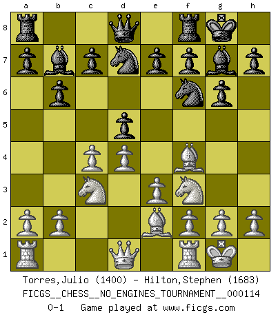 Last move : 0-1 2021 January 11 22:42:59 [Event "FICGS__CHESS__NO_ENGINES_TOURNAMENT__000114"] [Site "FICGS"] [Date "2020.11.26"] [Round "1"] [White "Torres,Julio"] [Black "Hilton,Stephen"] [Result "0-1"] [WhiteElo "1400"] [BlackElo "1683"] 1.d4 Nf6 2.Nf3 g6 3.Bf4 Bg7 4.e3 O-O 5.Be2 d5 6.O-O b6 7.c4 Bb7 8.Nc3 Nbd7 0-1 This chess game has been lost on time (started : 2020.11.26 22:31:16) King's Indian : London system Kingside Castling by player Black (move 4) Kingside Castling by player White (move 6) Player Black won this chess game. Follow this game move after move (download)The beauty of a move lies not in its' appearance but in the thought behind it. (Siegbert Tarrasch) Wenn ich mich einlogge, glauben die Leute gewöhnlich nicht, dass ich es selbst bin und sie fangen an, mir dumme Fragen zu stellen. Und wenn sie es glauben, stellen sie wieder andere dumme Fragen. (Judith Polgar) El Ajedrez es una guerra en un tablero. El objetivo es aplastar la mente del oponente. (Bobby Fischer) Les Echecs représentent une sphère d'idées créatrices basée sur la volonté des deux protagonistes. (Smyslov) Always be a first-rate version of yourself, instead of a second-rate version of somebody else. (Judy Garland)